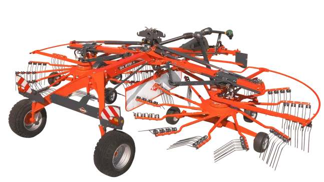 Os enleiradores de dois rotores GA 7631, GA 8131, GA 8131 CL, GA 8731+ e GA 9531+ fornecem leiras centrais. A forragem é enleirada em uma largura de 7,50 m a 9,30 m. O modelo GA 8131 CL é equipado com um sistema de elevação da forragem, uma caraterística exclusiva no mercado!