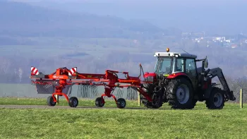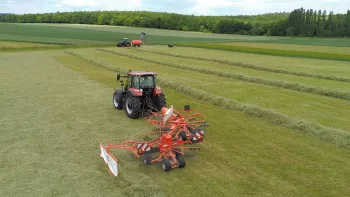 Os braços nos enleiradores GA estão em posição hipertangencial. Isso significa que eles atingem um ângulo de 90° muito tardiamente. Com o came de ângulo acentuado dos garfos, o distanciamento dos garfos é rápido, posterior e requer esforço rotacional menor para produzir leiras regulares, fofas e retas. O enleiramento é de alta qualidade mesmo em altas velocidades, pois a forragem não é empurrada além da leira.
