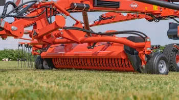 The deflector creates a nice even windrow. Adjustments such as the rotor speed or deflector position make it possible to adapt the raking to the type of crop. Thus, the risk of leaf loss is eliminated, and the work output remains constant.