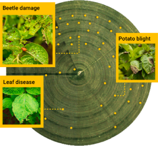 As plantações são monitoradas constantemente com uma variedade de sensores, de imagens de satélite a drones e sondas de solo. Qualquer fonte de dados existente é integrada à camada de dados para otimizar a saúde das plantas.