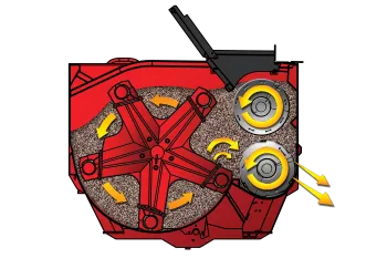 O rotor tombador mistura completamente de maneira delicada, sem causar dano excessivo aos ingredientes, preservando o precioso valor nutricional para o seu rebanho. O rotor eleva o material até os sem fins laterais para, em seguida, serem conduzidos de uma extremidade a outra do vagão misturador. O sem fim superior move a mistura para trás, e o sem fim inferior, para a frente, assegurando uma completa homogeneização da carga. O seu funcionamento em conjunto possibilita um fluxo contínuo de alimentos à porta durante a descarga no cocho.